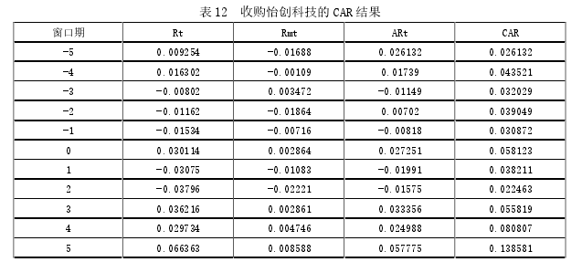 本文采用事件研究法計算日超額收益率和累計超額收益率來分析海格通信并購的短期績效,評價每起并購事件是否給公司帶來顯著效應。 第一步,確定事件日。本文以每次并購事件的首次公告日為事件日。選擇這個日期作為事件日是因為首次公告的日期是外界第一時間知道該并購事件發生的時間。 第二步,確定窗口期。本文的以首次公告日為時間中心時點,統計前后各五個交易日的股價變化,即窗口期定為(-5,5)。窗口期之所以設置在這個范圍,是因為在本案例中有些并購事件的首次公告日期時間間隔短,設置較長的窗口期會使兩起并購交易的計算日重疊,為盡可能減少事件的相互影響程度,故使用(-5,5)為本案例的窗口期。 第三步,計算日收益率 Rt。計算公式是 Rt=(Pt-Pt-1)/Pt-1 。 Pt是公司第 t 天的股票收盤價,Pt-1是指公司第 t-1 天的股票收盤價。 第四步,計算市場指數的日收益率 Rmt。公式是 Rmt=(Pmt- Pmt-1)/ Pmt-1。Pmt是市場指數第 t 天的股票收盤價,Pmt-1是市場指數第 t-1 天的股票收盤價,本文的市場指數使用的是深圳成指,本公司是深圳證券交易所上市的。 第五步,計算預期收益率(AR)。預期收益率可以運用市場模型法和市場調整模型法兩種方法來計算,一般對于單項并購事件學者們都用的市場模型法,但是在連續并購中有學者認為市場模型法并不適用 AR 的計算,特別是對于間隔期較短的連續并購,因為市場模型需要通過回歸估計貝塔系數,估計期的范圍一般在 100 天以上,而在連續并購間隔期較短時,后一起并購事件的估計期會覆蓋了前一起并購事件的窗口期,若前一起事件的市場反應顯著,那么就會對后面的回歸產生影響,導致貝塔系數估值不準確,因此認為用市場調整模型法更為確切。但是也有學者不認同此觀點,認為我國的資本市場是弱式有效,可以運用市場模型法。