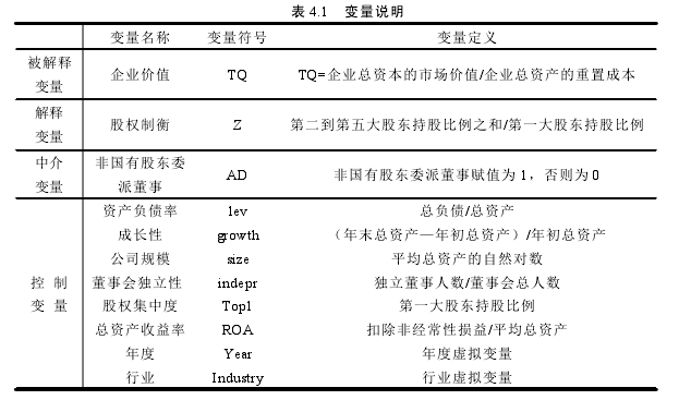在我國,國有企業早已存在混合所有制,而且國家控股的混合所有制企業已不再是少數。上市公司是混合所有制企業的典型代表。因此,本文選取的樣本為2014——2015 年滬深 A 股上市公司,在樣本的選擇過程中進行如下篩選:(1)剔除所有金融類上市公司,因為這類公司具有比較特殊的行業特征;(2)剔除 ST類公司以及所有者權益為負(資不抵債)的公司;(3)剔除數據缺失的樣本。最終得到了 1584 個樣本觀測值構成的混合數據。其中,134 家國有上市公司的非國有股東委派了董事,占公司總樣本比例為 8.46%;1450 家國有上市公司的非國有股東沒有委派董事,占公司總樣本比例為 91.54%。本文除了非國有股東委派董事的數據通過閱讀報表手工搜集之外,其他的均數據來源于 CSMAR 數據庫。為了消除極端值對研究結果造成的影響,本文對所有連續變量在 1%-99%水平上進行了Winsorize 處理。本文的數據分析與統計結果在 STATA13.0 統計軟件中完成。其中,非國有股東委派董事數據的搜集主要通過閱讀公司年度報表的方式,手工搜集非國有股東是否在董事會委派董事以及委派董事的人數。在“截止報告期末前十名股東、前十名流通股東(或無限售條件股東)持股情況表”中會披露前十大股東持股情況和股東性質,然后結合“在股東單位任職情況 ”判斷某一董事是否由非國有股東委派。由此,本文產生兩個變量,一個是非國有股東是否委派董事這一虛擬變量,另外一個是非國有股東委派董事人數。
