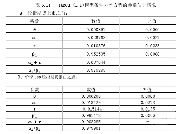 (2)從標的指數波動情況的影響來看 在滬深 300 股指期貨正式投入使用之后,我國滬深 300 現貨股價指數擁有了一段較為平穩的發展態勢。由此,通過上述實證結果我們可以認為,滬深 300股指期貨的市場交易及有效發展,能夠有效地起到發現價值以及風險管理方面的一些功能,在一定程度上打壓了現貨市場的波動性,使得股票的價格能夠與其實際的價格趨于一致。但是,因為期指市場在整個股票市場當中只是很小的一個部分,所以其作用是有限的。