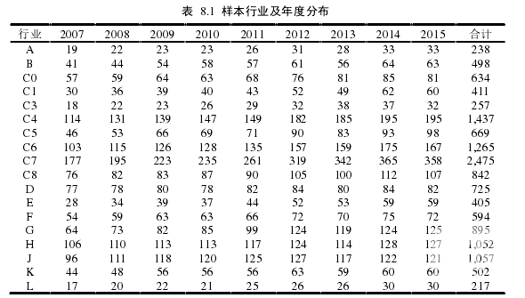 本章選取了 2005 至 2015 年的 2996 所滬深 A 股上市公司的年度財務報告數據為研究對象。對應分析師跟蹤數據為滯后變量,且由于數據可獲取性,選取的相應時間段為 2004-2014年。對樣本篩選的具體步驟如下:①剔除金融、保險業公司 58 家,由于金融相關行業的財務業績等計算具有行業特殊性,與其他行業區別較大,因此將其從樣本中剔除;②剔除首年上市公司、已退市公司、創業板公司 696 家,創業板及已退市公司在融資動機及業績獎勵計劃等方面與主板及中小板公司存在較大差異,而首年上市公司由于缺少前一期數據,因此將此類樣本公司剔除;③剔除重要財務數據缺失樣本;④刪除分析師相關跟蹤數據缺失個觀測值。剩余研究樣本包含 16,888 個公司-年度觀測值。上市公司財務報表數據來自國泰安CSMAR 數據庫,分析師相關數據來自萬得 WIND 金融數據庫。數據篩選和處理應用 STATA 13.0 軟件。本文按照中國證監會《上市公司行業分類指引》(2001)的一級代碼對于行業進行劃分,研究樣本的行業-年度分布如表 8.1 所示。但在數據分析時,對于制造業,按照研究慣例細分至二級代碼,因此樣本觀測值所處行業共涉及到19  個。