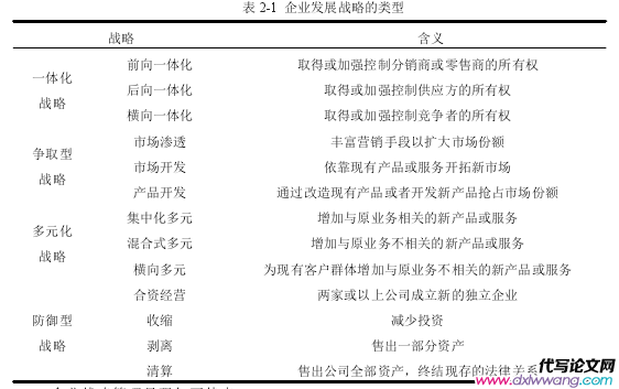戰略管理是從企業遠期發展目標出發,分析企業所處的內外部環境,確定最佳戰略方案,按此實施并獲得反饋意見的一種組織管理手段[39]。戰略管理的目的是保證企業擁有持續的競爭優勢,戰略制定者必須明確企業預期戰略以及采用何種方式來實現預期戰略目標[40]。企業發展戰略的主要類型如表 2-1 所示[41]。企業應當根據所處的不同環境,選擇相適應的戰略管理方法。企業戰略管理呈現如下特點:(1)全局性。企業發展戰略必須以企業整體為視角,深入分析企業所處的政治、經濟、技術、文化環境,從而為實現企業預期發展目標制定出全局性的戰略規劃。(2)長遠性。企業戰略管理是面向未來的遠期管理。為此,企業必須對未來發展環境進行評估,針對可能出現的情況預先提出防控措施,制定長遠性的戰略規劃。(3)競爭性。市場經濟面臨著激烈的競爭,在此環境下,企業必須明確自身存在的優勢與劣勢,抓住機遇,尋找適合自身發展的經營模式,塑造核心競爭力,實現企業又快又好發展。(4)相對穩定性與動態性。企業戰略是企業經營管理的重要指導,在一段時期必須保持相對穩定。當企業內外部環境發展較大變化時,必須對戰略進行及時調整,使企業保持持續的競爭優勢[42]。