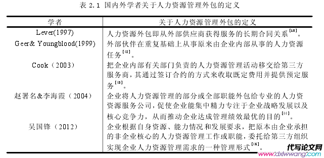 Outsourcing 即“外包”,意即企業通過簽訂合約的方式獲取外部服務商提供的某些產品和服務,從而使得企業獲得增強核心競爭力的時間與精力。外包的概念于上世紀 90 年代初由美國學者 Gary Hamel. C. K. Praharad 發表于《企業的核心競爭力》一文[41]。而外包的實踐的應用則早于其概念的提出,主要集中于制造型企業,如耐克、愛立信等均將部分生產任務外包給其他企業,自己則專注于設計與市場影響方面。而由于信息化管理水平的提高,外包已從生產制造領域逐步向銷售、人力資源等領域發展,為企業創造了更多的發展空間和機遇。結合國內外有關學者的論證,筆者認為人力資源管理外包即企業在發展的過程中,根據實際情況與需求,將自身的部分或者全部人力資源管理非核心業務委托給實力更強的專業外包商承擔,進而獲得更多的從事戰略性、核心性的人力資源管理工作中的精力,促使企業戰略規劃更好的實現。