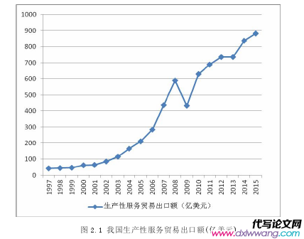 世貿組織的相關數據顯示,2015 年我國服務貿易進出口總額 7554 億美元,占世界的比重為 7.7%,位居世界第二。服務出口世界排名第五,進口排名第二。就總額來說,1997 年到 2015 年期間,服務貿易出口額從 342 億美元提升到 2865億美元,進口額從 280 億美元增長到 4689 億美元,進出口總額從 622 億美元增長到 7554 億美元,三者總體都是上升趨勢。從差額來看,服務貿易呈逆差狀態,并且逆差連續增加,從1998年的18 億美元逆差變為2015年的1824 億美元逆差??梢娢覈诜召Q易領域劣勢地位明顯,整體競爭力不強,落后于發達國家。由表 2.1 可見,生產性服務貿易的總量不斷擴大,從 1997 年的 177 億美元增長至 2015 年的 2193 億美元。就貿易差額來說,差額呈逆差狀態,且整體呈加劇態勢。生產性服務貿易進出口總額占服務貿易進出口總額的占比從 1997 年的28.46%上升到 2013 年的 42.06%,比重最大的是 2010 年,占比達到 64.13%。這說明我國生產性服務貿易在服務貿易中的占比穩步提高。2014 和 2015 年,生產性服務貿易占服務貿易的比值急劇下降,從 2013 年的 42.06%下降到 2014 年的33.47%和 2015 年的 29.03%,這是由于旅游貿易進出口總額從 2013 年的 1803 億美元迅速增長到 2014 年的 3401 億美元和 2015 年的 4063 以美元,而本文沒有將旅游服務納入生產性服務之中。從表中可以發現,1998 年、2009 年我國服務貿易進口額、出口額以及進出口總額都呈下降趨勢,生產性服務貿易亦是如此。這說明我國生產性服務貿易對我國服務貿易有一定的影響。