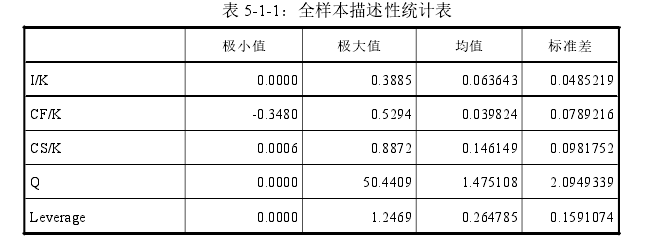 從表 5-1-1 全樣本描述性統計表可以看出,投資 I/K 極大值為 0.3885,極小值為 0.0000,極大值極小值之間存在差異,標準差為 0.0485219,表明樣本企業之間旳投資行為和投資能力存在一定差異?,F金流量 CF/K 與現金存量 CS/K 的標準差相差不大,指標波動情況較弱。CF/K 的均值為 0.039824,極大值為 0.5294,極小值為-0.3480,均值與極大值極小值差異較大,說明不同企業的經營性現金流差異較大;Q 的標準差為 2.0949339,極大值與極小值之間較大,表明樣本企業之間的的投資機會存在較大差異。國有上市公司的 I/K 均值為 0.058547,低于民營上市公司的 I/K 均值 0.068311,說明國有上市公司的投資較民營企業投資占總資產比重略低。國有上市公司 CF/K 均值為0.042322 高于民營上市公司 CF/K 的均值 0.037536,說明國有上市公司的經營性現金流較民營上市公司更為充沛;國有上市公司 Q 的均值為 1.123067 低于民營上市公司 Q 的均值 1.797532,說明民營上市公司投資機會更為豐富。國有上市公司的 Leverage 均值為 0.299521,高于民營上市公司均值 0.232970,說明國有上市公司能更多地用好杠桿提高經營效率。