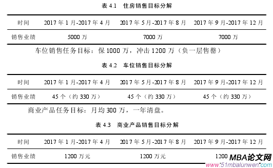 克拉美麗山莊項目定位為區域宜居生態地產,打造環境優美、交通便利、適宜居住的中產階級品質生活社區。自2016年開始,本項目便開始了前期營銷準備。根據前文的分析,確定克拉美麗山莊的銷售目標與銷售實施步驟如下:結合目前市場現狀,項目的營銷能否順利進行在很大程度上取決于 2017 年的大經濟環境的發展形勢,據此分析判斷,我們對 2017 年度的營銷任務做如下安排。由于可銷售住宅面積偏大,消化周期較長,綜合項目實際情況考慮,2017 年住宅銷售(含車位部分)合計總銷售金額 2.23 億元。