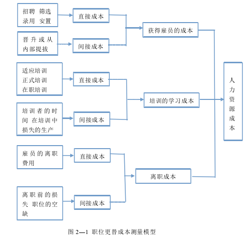 人力資源成本理論的提出源于 1966 年瑞士日內瓦舉行的第十一屆國際勞工統計大會,大會通過了“人力資源成本”的概念。人力資源成本是指“組織為了實現自身的目標,取得最佳經濟效益和社會效益,而獲得、開發、使用、保障必要的人力資源及人力資源離職所支出的各種費用的總和。[15] 綜合上述人力資源成本的概念,可以發現,人力資源成本可以分為以下四類: 獲得成本:是指企業在招聘、選擇、錄用、安置人力資源時產生的各項費用的總和,包括招聘錄用等環節的時間成本和物質成本; 開發成本:是指企業為了提高員工的工作能力而對本企業的員工進行的各種入職培訓、在職培訓、特殊培訓等各種時間成本和物質成本; 使用成本:是指企業在使用人力資源過程中使用的成本,例如員工工資、福利津貼或者對有突出貢獻的或有特殊業績的員工所支付的獎勵、調劑員工生活與工作壓力的成本以及員工的各種社會保障如養老保險等成本;[16] 離職成本:是指員工離職時給企業帶來的各種諸如離職費用、崗位空缺、培訓資本浪費等各種時間成本或者物質成本。 其中,人力資源的獲得成本、開發成本和使用成本屬于直接成本,離職成本則屬于間接成本。 世界著名人力資源會計研究者福萊姆?霍爾提出了一個計算人力資源替代成本的粗略測量模型如圖 2—1: