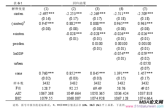 6.1 能源消費碳強度,即單位能源消費會產生的二氧化碳排放量。能源消費強度主要受能源結構和能源利用效率的影響,既可以反映能源質量,也可以衡量能源利用效率(林伯強,2010)。如果一個城市能源消費碳強度較高,則說明該城市能源結構主要以高污染的能源為主,如煤炭等,清潔能源使用不足;或者表明該城市的能源利用率偏低,因此可以通過改變能源消費結構,加強技術改革,提高能源利用效率的方法來進行減排,要付出的減排成本相對較低。預期能源消費碳強度與邊際減排成本之間關系為負。