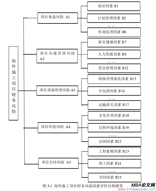 首先,根據第四章中所得到的海外施工項目關鍵財務風險因素,以及因子分析結果,將財務風險因素分為了三層,即目標層,由目標層(海外施工項目財務風險評價),準則層(評價的一級指標),指標層(評價的二級指標)共同形成的層次模型。并依據關鍵財務風險因素,構建海外施工項目財務風險評價結構模型及指標 。圖 5-1 所示的模型是目標層海外施工項目財務風險,準則層評價的一級指標,其中包括五個指標,即項目準備風險 A1,項目溝通管理風險 A2,項目現場管理風險 A3,項目環境風險 A4,項目合同風險 A5。在準則層指標之下為指標層,評價的二級指標。其中,項目準備風險包括政治因素 B1,計劃管理因素 B2,咨詢監理風險因素 B3 等;項目溝通管理風險包括雇員健康風險因素 B7、人力資源風險因素 B8、資金管理風險因素 B12 等;項目現場管理風險包括現場管理混亂因素 B13、分包商因素 B14、運輸清關因素 B17 等;項目環境風險包括文化差異因素 B18、自然環境因素 B19、法制因素 B22 等;項目合同風險包括工程索賠因素 B23、竣工因素 B24、合同因素 B25,共同形成的層次模型。