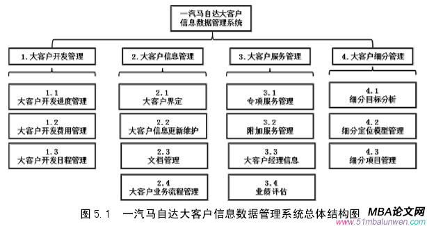 企業管理機制隨著大數據時代的帶來必須要進行相應的變革,對于企業來講,大客戶資源就是公司的金融資產。精準識別大客戶并進行科學的分析是企業做好大客戶營銷的前提。通過收集客戶信息,對客戶的核心需求進行準確的分析和挖掘才能保證大客戶的開發與維系的成功推進,而這一切都是以完善的大客戶信息為前提的。構建大客戶信息數據管理系統的目的就是將線下的無序的、不規范的、隨機性的大客戶信息管理轉移到線上進行有序的、規范的、及時性的信息管理。通過前文對于一汽馬自達大客戶管理工作現狀及未來的發展目標的分析,可以得出一汽馬自達的大客戶信息數據管理系統需要實現的主要功能模塊,如圖 5.1 所示:由圖 3.1 一汽馬自達組織機構圖可見,大客戶經理在目前公司所處的層級是非常之低的。但大客戶的需求往往又是非常高的,由于大客戶經理的授權有限,無法第一時間同大客戶進行對等的溝通與決策。按照現有的組織機構與流程,大客戶經理得到大客戶銷售機會時需要逐級上報審批;而當大客戶主動接洽公司高層時,高層經理人員則會將業務逐級下放,直至傳遞至大客戶經理處,浪費的大量的時間與精力。商場瞬息萬變,機會轉瞬即逝,機構的冗余和信息溝通不暢,往往因此錯失銷售良機。
