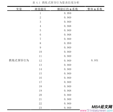 為保證論文的嚴謹,在對數據進行回歸分析之前,對量表測得的數據進行信度與效度的檢驗,下面分別對教練式領導行為、情感承諾、員工工作倦怠進行信效度的測量。效度是指是否正確的測量得到了想要測量的概念,包含內容效度和構念效度。內容效度指題目的設定是否有代表性,對實際情況的測量效果;構念效度指獲取的結果與量表的理論設計是否契合。本文的量表均是成熟量表,在國內外的實證研究中均有使用,可以表現出合理的內容效度。本文采用探索性因子分析的方法來測量構念效度,結合 KMO 指和 Bartlett 球形檢驗以及總變量解釋率來進行效度分析。
