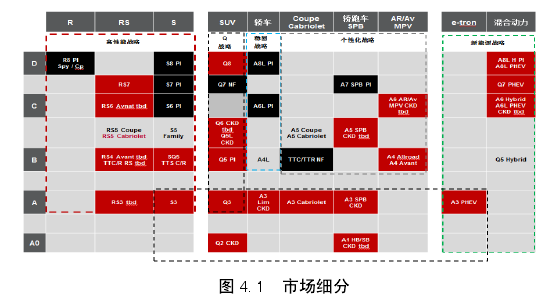 目前中國汽車市場主要分為超豪華車市場,如保時捷,賓利,瑪莎拉蒂等;豪華車市場,主流品牌有奧迪,寶馬,奔馳,路虎,沃爾沃等;以及普通乘用車市場,大眾,豐田,起亞等,以及眾多國產車品牌如奇瑞,吉利,長城等。市場細分通常按照用戶群體來劃分,而在汽車市場,不同的車輛級別和車身概念正是由不同的用戶群來劃分的,舉例來說,A級別的用戶可能個性時尚,年齡很小,追求潮流與個性;而D級別的用戶則多穩重大氣,是成功人士的首選。奧迪屬于豪華車市場,將這一市場按照車輛級別以及車身概念來進行市場細分,在車輛級別中如要以車輛的軸距尺寸作為衡量標準,從A0級別一直到D級別,而從車身概念進行細分,有SUV車型,轎車車型,Coupe/Cabriolet車型,Sportback轎跑車車型,Allroad/Avant旅行車,以及代表新能源的電動車車型和混合動力,以及高性能車型,對應的車輛級別與對應的車身概念相結合,即為某個車型所屬的細分市場。舉例來說,豪華A級別細分市場,主要由奧迪A3,寶馬1系,奔馳A級別進行競爭;以及豪華D級別細分市場,主要代表產品奧迪A8,寶馬7系,奔馳S級別;同樣SUV市場也以A、B、C、D級別劃分,如豪華C級別SUV市場,主要競品為奧迪Q7,寶馬X5,奔馳GLE;而像奧迪A5Coupe車型,從車身級別上屬于B級車,從車身概念屬于Coupe概念,則A5Coupe車型則屬于B級Coupe細分市場(如下圖所示)。