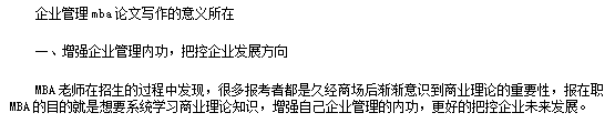 論文選題論文的寫作過程也是一個研究過程,如果能夠以自己的研究結果寫成論文,可以得到更大的收獲。因此,在著手寫作之前,應該明確:我要研究的問題是什么?怎樣進行研究?有了回答之后,后面論文的進展至少可以保證有了骨相。圍繞MBA的特點,可以選擇的方向大致有:戰略管理、薪酬管理、績效考核、企業文化、營銷管理、產業集群發展、民營企業管理、產業發展管理、循環經濟、城鄉經濟發展、銀行管理、商業模式發展、自主創新、供應鏈研究、電子商務、企業核心競爭力、品牌發展等,根據專業選擇適合和自己熟悉的領域進行?! 《?、論文的意義和作用