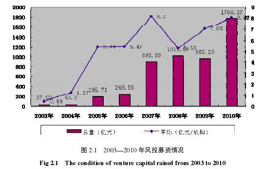 進入 21 世紀以來,我國金融業取得了巨大進步,風險投資業也隨之快速發展。在資金募集量、投資規模及 IPO 等方面都表現出十分活躍的景象,與此同時,我國的風險投資案例也呈現出爆發式增長的態勢,市場規模達到了歷史的高峰。尤其是在 06、07 年,我國資本市場異?;钴S,企業 IPO 數量劇增,帶動了風險投資的火爆增長。整個行業表現出如下幾個特點:歐美經濟仍然深陷危機之中,全球經濟還尚未復蘇,但中國的宏觀經濟還保持著健康快速的增長,國民經濟整體處于良性發展之中?!妒鍛鹇砸巹潯分刑岢龅慕洕鲩L結構戰略性調整和重點培育新興產業都在逐步加速推進。受到我國宏觀經濟多重利好因素的不斷推動,風險投資對我國各行業的投資熱情十分高漲,風險市場上的資金募集規模更是大幅度的增長。2003年我國風投募集資金僅 37.02 億,到 2010 年已大幅增長到 1768.37 億,年均增幅 73.7%。 2010 年我國共有 194 支人民幣基金完成募集,占完成募集基金總數的 88.58%,共募集人民幣 1121.65 億元,占募集資金總額的 63.43%,不論是完成募集的基金數量還是募資規模比例都有大幅增加;2010 年我國共有 25 支外幣基金完成募集,占完成募集的基金總數的 11.42%,募集到的外幣資金規模為 646.72 億元,占募集資本總額的 36.57%。