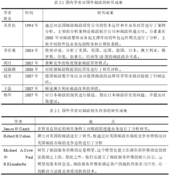 對于各國郵政改革的總體評論的研究成果不多。表 2.1 是國內學者對國外郵政的相關研究成果。表 2.2 是國外學者對郵政相關內容的研究成果。