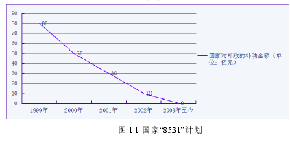 在 1998 年郵政拆分以前,中國郵政的傳統經營項目主要是一些勞動密集型的函件、報刊發行等業務。這種業務的特點是業務收入較低。主營業務收入低的同時,郵政同時還在承擔著國家普遍服務的功能。巨大的壓力下,我國郵政一直處于嚴重的虧損狀態,上個世紀末,中國郵政總公司虧損總額上百億。針對郵政的現實困難國家特別推出了一個扶持郵政的計劃,即“8531”計劃。這個計劃是:在 1999 年國家補貼郵政 80 億元,2000 年國家補助郵政 50 億元,2001年國家補助郵政 30 億元,2002 年國家補助郵政 10 億元,從 2003 年起,國家對郵政不再進行補助,中國郵政進入自主盈虧的階段。如圖 1.1 所示。