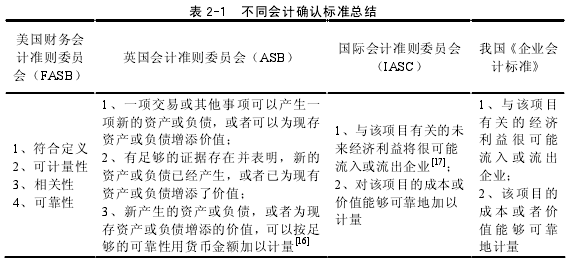雖然美國財務會計準則委員會(FASB)提出的上述定義被認為是迄今為止較為權威的會計確認的定義,但是對于會計確認的標準至今還沒有一個統一的結論。文章對于當今主流的會計確認標準進行以下的歸納總結,如表 2-1。