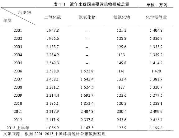 近年來隨著全球變暖、溫室效應、排放空間有限等全球環境問題的日益嚴重,節能減排已經成為全球各國共同追求的目標之一。我國作為世界上最大的發展中國家,在科學技術、生產力水平不斷提高的同時環境污染問題給我國各方面帶來的危害也在不斷加深。亞洲開發銀行和清華大學發布的《中華人民共和國國家環境分析》報告中指出中國有太原、北京、烏魯木齊、蘭州、重慶等七個城市位居全球十大污染城市,另外據調查我國能達到世界衛生組織空氣質量標準的城市比例還不到 1%。在環保部最新發布的 2013 年第一季度我國調查的 74 個城市空氣質量中總體達標天數比例僅為 44.4%,超標天數比例高達為55.6%,合格比例還不足一半。其中居于我國 2013 年第一季度污染城市第一的石家莊市在 2013 年一月到五月期間僅有 12 天空氣質量達到了優良等級。僅 2012年全國化學需氧量排放量就為 2 423.7 萬噸,氨氮排放量為 253.6 萬噸,廢氣中二氧化硫排放量為 2 117.6 萬噸,氮氧化物排放量為 2 337.8 萬噸[1]。這些數據清楚的顯示出我國的環境污染問題已經成為危害民生的大問題,雖然 2012 年污染物排放量相較去年有所下降但是長期這樣龐大規模的污染物排放量帶來的環境問題令人堪憂。由于硫化物、氮氧化物等污染物質的大量排放不僅給空氣帶來嚴重污染,也對水源質量造成了嚴重的影響,在 198 個城市 4 929 個地下水監測點位中,優良-良好-較好水質的監測點比例為 42.7%,較差-極差水質的監測點比例為 57.3%,我國的酸雨范圍已經達到了國土面積的 12.2%。為了更加直觀了解我國近年來環境污染的程度,本文根據近 13 年的我國環境統計公報,列舉出 2000-2013 年上半年四種主要污染物在我國的排放總量,具體情況如表 1-1 所示。從這些觸目驚心的數據可以看出我國的環境污染問題正在日益加劇,并且已經成為了危害民生、阻礙經濟發展的重要問題,必須盡快找到合理有效的方法減少污染物的排放,改善環境,保護人類賴以生存的唯一家園。
