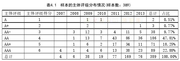 本文以 2007 年至 2013 年 09 月我國債券市場發行的公司債為樣本,剔除掉一些數據不全、數據異常的樣本,剩余 389 個公司債樣本。本文采用 Ordinal 模型實證分析了公司財務風險對信用評級的影響,包括公司債債主體等級和債券信用等級,為了檢驗 Ordinal 模型的實證結果,也用二元 Logistic 模型進行穩健性檢驗,研究的發現主要有: