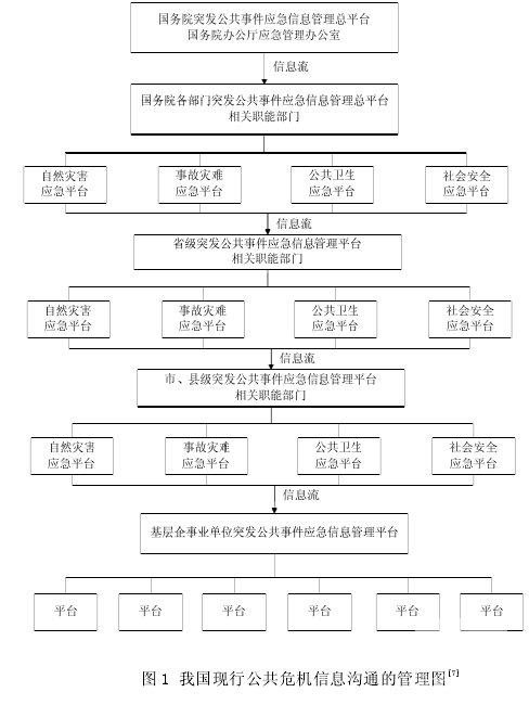 ?上圖顯示了我國的公共危機溝通呈現層級式,已形成國家、省級和市縣級三級溝通平臺。國務院是我國突發公共事件應急管理中心平臺的核心機構,負責統領全國的公共危機管理工作。國務院又分別設立了應對公共危機的相關職能部門,有自然災害應急管理平臺、事故災難應急管理平臺、公共衛生應急管理平臺、社會安全應急管理平臺。省級政府根據國務院設立的突發公共事件應急管理中心平臺,又設立了省一級的應對公共危機的相關職能部門,四個平臺也和國務院的一樣。市、縣級政府又根據省級政府的模式設立了市、縣一級的四個應急平臺。從而形成了現在的公共危機溝通的“縱向集權式”管理流程模式。這種公共危機溝通的“縱向集權式”管理模式,明確規定了各級政府和各職能部門在公共危機管理中的權力及相關職責,由國務院統領全國的公共危機管理工作,地方各級政府做好分工合作,充分發揮了集中領導的優勢,有利于加快危機信息的傳播,有利于保證危機溝通渠道的暢通,提升政府的公共危機管理能力。