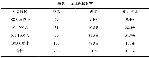 ?企業的員工人數是管理學研究中重點關心的企業特征之一,并被認為是反映企業規模的重要指標。本研究的調研樣本具有較大的分散性,包括了各種類型的企業人員,如表 5.1所示,100 人以下的企業占比 9.4%,101-500 人的企業占比 10.8%,501-1000 人的企業占比31.5%,1000 人以上的企業占比 48.3%。