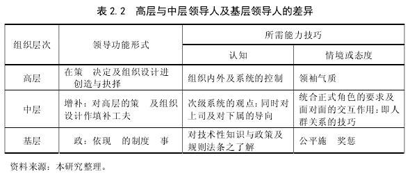 領導者(leader)一詞,早在一千三百多年以前就出現(Bass,1985),而領導者依其所處的地位層級,區分為高階主管、中層主管、基層主管(張志育,1998)。至于各階主管所應具備的管理技能,Katz(1955)認為優秀的管理者應具有技術性技能、人際關系技能,以及概念化技能等三種管理技能。而此三種技能的重要性,又因主管階層的任務與性質而有所不同。