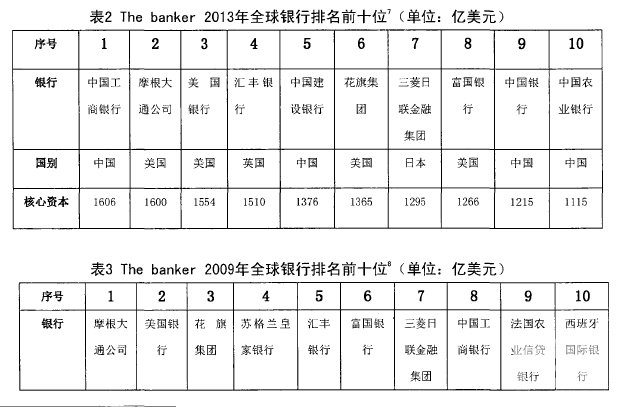 銀行業中的集權過程是其實現職能的前提,只有具備充足的資金才能更充分的發揮銀行的作用和職能。事實上,按照慣例都用銀行資本額的多少來衡量銀行實力的強弱。從國際上關于銀行業的排名來看,資本越雄厚的銀行排名也越靠前。英國著名銀行業雜志Thebanker公布了 2013年全球銀行業的排名可以看出(表2),中國工商銀行以160646億美元的核心資本位于榜首,美國的JP摩根公司排在第二位。于此形成對比的是2009年該雜志公布的全球銀行業排名(表3)。從這兩個表格可以得出以下結論: