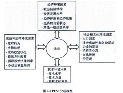 PEST分析模型是指宏觀環境的分析,宏觀環境又稱一般環境,是指影響一切行業和企業的各種宏觀因素。對宏觀環境因素作分析,不同行業和企業根據自身特點和經營需要,分析的具體內容會有差異,但一般都應對政治(Politics)、經濟(Economy)、社會(Society)、技術(Technology)這四大類來分析企業所處外部環境所面臨的狀況。