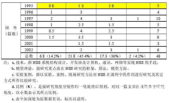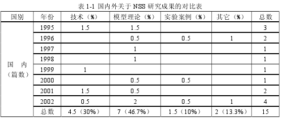 表 1-1是 1995 年到 2002 年國內外關于NSS研究成果的對比表,客觀反映了NSS的研究現狀及發展方向。