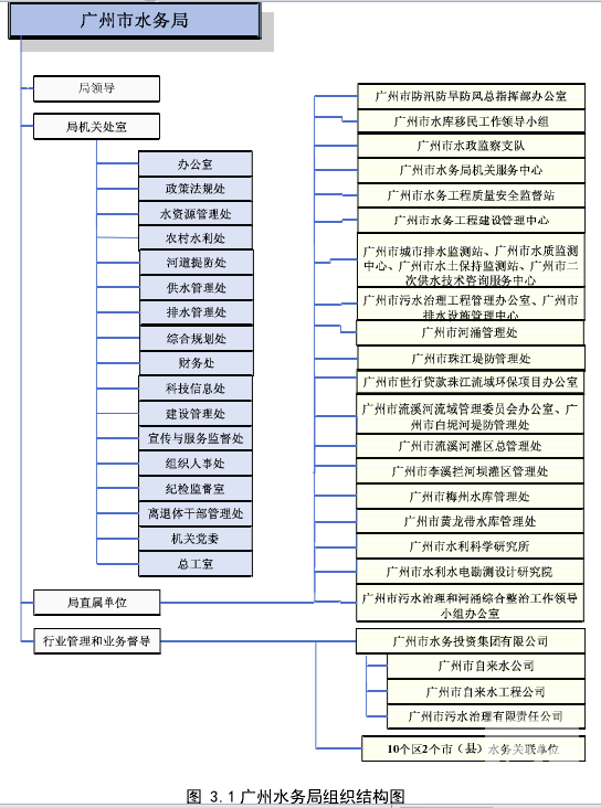 廣州市水務局隸屬于廣州市政府,是市政府主管全市水行政的工作機構。廣州市水務局內設 14 個職能處室,19 個直屬單位,13 個行業管理和業務督導單位。廣州市水務局的組織結構受外部環境的影響以及內部創新管理需要,組織架構以及職責會不斷的進行調整,如 2008 年初,水務局進行大的機構重組,新增供排水管理業務,相應的也增加了對應的處室。2008 年 12 月 16 日,廣州市水務投資集團有限公司正式掛牌成立,原屬水務局管理的下屬單位:廣州市自來水公司(簡稱“自來水公司”)、廣州市自來水工程公司、廣州市污水治理有限責任公司劃歸水投集團,水務局負責行業管理及業務督導??梢钥闯稣麄€水務系統組織、業務都會經常調整 ,目前組織架構如圖 3.1 所示,主要包括局處室及下屬單位。?