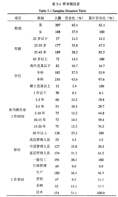 ?本研究在西安、蘭州、太原、深圳、青島、昆山、上海多家企業共發放問卷563份,回收有效問卷495份,有效問卷回收率87.9%。樣本情況如表5一1所示。