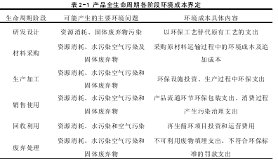 產品和人一樣,也會經歷形成、成長、成熟、衰退這樣的周期,產品從產生直至消亡整個過程所經歷的期間就是全生命周期。每件產品在在其全生命周期過程中會經歷從產品形成、原材料獲取、產品生產、產品使用、消費、回收或廢棄這樣一種生命周期。產品全生命周期的每一個階段都存在著資源的溢出或消耗,各個生命周期不同階段也會對環境產生不同的影響,如圖 2-2 所示。由圖 2-2 可知,產品在生命周期每一個環節都會消耗資源、能源,并向環境排放廢水、廢氣、固體廢棄物等污染物,為了減輕污染物對環境的影響就必須做好預防及治理工作,投入相應的環境成本。所以,全生命周期環境成本是指產品從開始醞釀,經過論證、研究、發展、生產和使用,直到報廢環節整個生命周期內產生的設計與開發費用、生產費用、使用費用以及最終廢棄費用的總和。全生命周期環境成本不再僅僅局限為企業的生產過程中所產生的環境成本,而且還應該包括產品從設計、生產、銷售、使用直至報廢這整個流程中所產生的環境成本。因為不同的生命周期階段環境成本的范圍有所差異。因此本文依照全生命周期的思想,將環境成本重新界定,如表 2-1 所示。