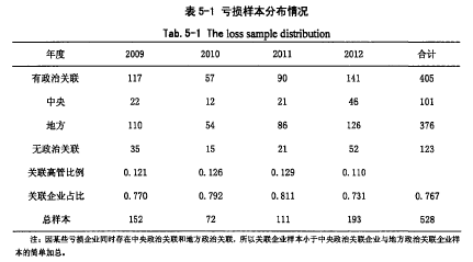 本文選取2009-2012年我國滬深兩市虧損上市公司為研究樣本,根據研究需要,數據時間跨度為2008-2013年。我們根據巨潮資訊網的企業年度財務報表手工搜集整理樣本公司政治關聯相關數據。政治關聯數據從企業年報“董事、監事、高級管理人員和員工情況”整理而得。本文其他相關財務數據均來自國泰安CSMAR數據庫。并按照研究慣例副除一些不符的樣本,最終獲得528個樣本公司,其中2009-2012年樣本分別為152、72、111、193個,具體副除標準為:(1)剔除相關數據缺失的樣本;(2)副除金融保險類虧損公司;(3)剔除存在異常值的樣本。四、年報中“董事、監事、高級管理人員和員工情況”披露不詳的虧損公司。本文釆用Excel、Statal2.0統計軟件進行數據處理和統計分析。從表5-1對我國虧損企業的樣本選擇情況可看出,2009-2012年存在政治關聯的虧損企業占當年虧損企業總數的比例均超過70%,說明政治關聯普遍存在于我國虧損企業中;同時,相比于中央政治關聯,更多的企業建立了地方政治關聯,之所以虧損企業熱衷于建立政治關聯,是因為地方政治關聯給企業帶來的影響更大。與前文分析一致,這也一定程度上說明了本文樣本選擇的合理性。