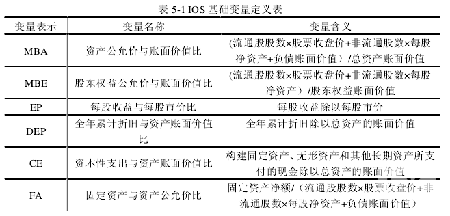 通過第三章對相關概念的界定,我們知道投資機會集是衡量企業面臨投資機會多寡的一個綜合性指標。一些國外學者通過選用幾個相關指標來表示企業的投資機會集,再運用因子分析方法進行計算。因子得分數值較高的企業表示企業富有投資機會,較低的表示企業缺乏投資機會。選取滯后一期的 MBA、MBE、EP、DEP、CE 與 FA 六個變量作用構成投資機會集的基礎變量,通過因子分析,求得公共因子,以此衡量公司的成長性。表 5-1,表 5-2 分別給出各變量的定義說明、描述性統計和相關系數。 表5-2顯示的是投資機會集的6個基礎變量的描述性統計和相關性分析結果,利用因子分析方法對這 6 個基礎變量進行處理,最終從 6 個變量中提取出主要信息構成投資機會集的代理變量 IOS。用 IOS 表企業面臨的投資機會。