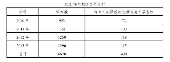 本文研究的目的在于研究上市民營企業家擁有海外居留權對公司價值的影響及其影響機理。論文選取的研究樣本為 2010 年、2011 年、2012 年、2013 年的民營上市公司。 在樣本初期,文章收集了 2010-2013 年 4 年的上市公司的數據和信息,并明確文章研究對象主要針對民營企業實際控制人在國內創業并且企業在國內上市之后擁有海外居留權這一情況對公司價值的影響?;诖?,①在基礎數據庫中首先篩選刪除非民營企業,在非民營企業之中,可以預見的是大部分為國有企業,其中不乏中央企業,國資委和地方國資委控制的企業以及中央部門地方部門控制的企業。②在第一步驟的基礎上進一步篩選,刪除的重點為中國部分大學控股的企業以及實際控制人為集團公司的上市企業,集團公司為實際控制人的上市企業無法得知其真正的實際控制人信息,同時將實際控制人不存在的企業也刪除。③在第二步的基礎上,篩選刪除國外華僑以及國外集團公司、國外友人在中國大陸上市的企業,這部分人群的動機與文章要研究的民營企業家移民群體的動機有所區別,這部分人群大多看好國內投資環境然后在國內投資創業并上市,其中尤以來自港澳臺地區的實際控制人為多。④在剩下的擁有海外居留權的上市公司樣本中主要為國內創業并且企業在國內上市的企業,為了區分動機進一步篩選刪除是否在國外留過學,并且將在國外留學的實際控制人樣本刪除。⑤對個別樣本進行判斷并篩選刪除或者保留。在前面四步的篩選工作之后具體的研究樣本見表 2。