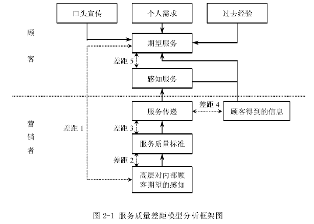 1988 年 Berry  和其同事 Parasuraman、Zeithaml  提出了一種用于服務質量管理的理論模型——服務質量差距分析模型,其目的是分析服務質量問題產生的原因并幫助服務企業的管理者了解如何改進服務質量。在顧客享受服務場所為其提供的服務的過程之中,顧客與服務提供者之間存在諸多差距,若試圖彌補這些差距,則首要任務就是找出這些差距,據研究發現,差距之所以會存在,是因為商家對于顧客期望得到的服務以及顧客本身真實的需要之間存在理解上的不同,想要彌補差距留住顧客,彌合這些差距對于企業至關重要。 如前所述,在服務質量的提供過程中,存在有諸多差距,集中在一點是服務質量差距。發現顧客期望及感知服務程度的有效方法是進行實地顧客滿意度調查,通過調查了解顧客最真實的需求,差距分析方法是成熟有效的衡量手段,所謂的差距分析是用來確定和糾正期望以及實際服務水平之間差距的一種手段。