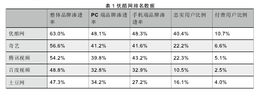 據中國互聯網信息中心發布的《第 35 次中國互聯網絡發展狀況統計報告》,截至2014 年 12 月,中國網民規模達 6.49 億,其中網絡視頻用戶規模達 4.33 億,網絡視頻用戶使用率為 66.7%。網絡視頻用戶每天在網絡視頻上投入較大比例的時間,80%以上的視頻用戶收看視頻節目的日均時長高于 30 分鐘,而 32.4%的電腦用戶和 20.9%的平板電腦用戶收看網絡視頻的時長高達 2 小時以上。1另據艾瑞數據統計,截止到 2012 年 5 月,中國在線視頻用戶規模首次超越搜索服務躍居第一,繼時長份額居首后又成為覆蓋最多網民的網絡服務,網絡在線視頻成為互聯網第一大應用2。諸多統計數據強調了網絡視頻行業的重要地位,可以說視頻網站的發展方向很大程度上決定著中國互聯網將何去何從。在這一背景下,對中國視頻網站的研究將為了解中國互聯網前景提供啟示。2014 年被業內定義為為“自制元年”。在經歷了 UGC(User GeneratedContent,用戶制作內容)視頻分享模式、購買電視臺劇目版權的 PGC(Professional Generated Content,專業制作內容)模式后,國內主流視頻網站紛紛將目光轉向自制節目。若想在眾多同質化的競爭者中搶占先機,塑造鮮明的品牌形象,視頻網站必須生產帶有自身鮮明烙印的自制內容。以《曉說》、《老男孩》、《屌絲男士》等劇為代表的自制節目不斷將收視率推向高潮,充分展現了網絡自制節目的發展潛力?!兜?35 次中國互聯網絡發展狀況統計報告》指出,內容依然是視頻網站的核心競爭力,視頻網站的發展始終依托于高質量、差異化的自制內容。在這一背景下自制戰略將持續成為視頻廠商的重要著力點。自 2004 年網絡視頻進入中國,歷經 10 余年的市場競爭與行業內部整合,網絡視頻行業迅速發展并成熟,其競爭格局基本達到了穩定。優酷、土豆、奇藝等視頻網站逐漸成為行業強勢公司并壟斷國內網絡視頻行業。優酷網憑借其整合專業影視節目、自制節目和 UGC 內容的優勢,占據了網絡視頻行業的頭把交椅,其整體品牌滲透率、忠實用戶比例和付費用戶比例上均遙遙領先于其他視頻網站,可以說代表了中國視頻網站的最高水平。然而中國的視頻網站發展雖快,但畢竟起步時間晚,尚未成熟,當 UGC 模式和PGC 模式都無法進一步滿足視頻用戶多樣化、高要求的觀看習慣時,優酷網開始嘗試自制內容以尋求新的發展方向。本文分析優酷的自制內容,審視中國視頻網站自制內容存在的問題,并探尋解決策略,對其未來發展前景提出思考和建議。