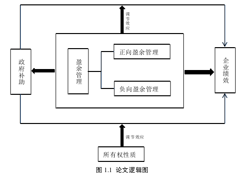本文將研究視角定位于我國 A 股上市企業,并由此建立盈余管理、政府補助與企業績效的關系。在梳理了盈余管理相關文獻的基礎上,分類整理了盈余管理與政府補助、盈余管理與企業績效的研究成果,圍繞盈余管理、政府補助對企業績效的影響這一問題展開研究。繼而闡述了與政府補助相關的研究文獻,分類整理出政府補助與企業績效的相關性研究成果。首先從理論上證明企業盈余管理與政府補助,政府補助與企業績效之間的密切關系。然后通過搜集 09—14 年中國 A股主板上市企業的相關數據,采用實證研究方法,建立回歸模型。進而根據模型的回歸結果說明盈余管理對政府補助、政府補助對企業績效所產生的影響,探討盈余管理與政府補助是否對企業績效具有共同影響作用,如圖 1.1 所示。本文主要對以下三個問題進行探究: 研究問題一:基于本文的研究視角,我國上市企業如何進行具有中國特色的盈余管理?本文的研究重點之一就是盈余管理方向與政府補助的相關性,以及盈余管理是否與政府補助存在相關性,是采取負向盈余管理還是正向盈余管理更能獲取政府補助,這些問題可通過理論和實證得出相關結論。 研究問題二:政府補助對企業績效有何影響?國內外的眾多研究成果表明,政府補助可提升企業績效,所有權性質的不同導致企業獲取政府補助的難易程度不同。本文試圖通過數據分析,證實政府補助對企業績效確實具有積極影響,并引入調節變量所有權性質,來證實所有權性質對政府補助的邊際效用有顯著影響作用。 研究問題三:盈余管理、政府補助與企業績效之間有何關系?本文基于提出的研究假設,并結合理論研究基礎和實證分析,闡述盈余管理、政府補助與企業績效這三者之間的相互關系。