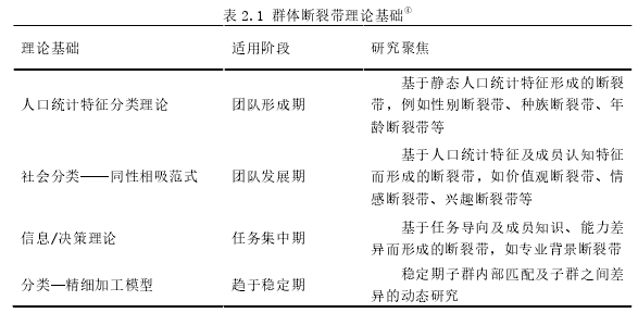 Dora C.  Lau 和 J. Keith  Murnighan  (1998)認為傳統團隊異質性研究中,研究人員往往對成員單一特征異質性進行考察,忽略了成員其他特征的潛在影響以及眾多特征之間的協同作用,故應該尋找一種方式能夠對團隊成員多重特征進行聚合?;诖?,Lau 等借鑒了地質學中的地理斷裂帶概念,提出群體斷裂帶理論。中國學者李小青、周建(2014)基于以上思考,同樣認為基于高階梯隊理論的傳統異質性研究關注單一人口統計指標的做法值得商榷,團隊成員多樣化特征動態聚合所形成的群體斷裂帶對組織影響要比異質性特征本身更具有重要意義,并因此希望通過群體斷裂帶視角對董事會群體行為過程進行深入挖掘。 “群體斷裂帶”是以團隊成員一種乃至多種屬性為基礎,將團隊分劃為多個子群的虛擬分割線,是成員多樣化特征的動態聚合。此外,Lau 等(1998)認為一個團隊的群體斷裂帶并非是唯一的,而是基于團隊成員不同特征形成的若干條分割線,這些分割線將團隊劃分為不同子群。 群體斷裂帶理論基礎主要包括人口統計特征劃分理論、社會分類理論—同性相吸范式、信息/決策理論、分類—精細加工模型。 人口統計特征分類理論來源于人口統計學理論,它基于人口統計特征(如年齡、性別、種族等)對團隊成員進行識別并劃分。社會分類理論——同性相吸范式(Abrams, Wetherell, Cochrane, Hoggs 等 1990;謝小云,張倩,2011)認為個體具備強烈的自我認知與考評意識,而且個體的考察與評價過程通常是與其他個體進行互相對比來實現。通過與其他個體進行比較,個體會尋求其他個體的認同感并且形成“圈子”格局。