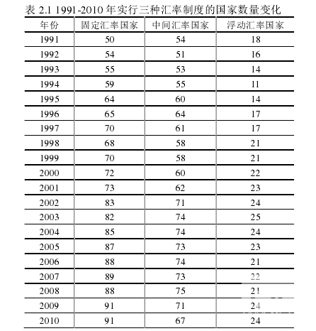 本章首先對中間匯率制度的相關概念進行界定,接著比較 1991-2010 年以來實行中間匯率制度與實行固定、浮動匯率制度的國家數量變化,并分析其規律,之后對實行這三種匯率制度國家的經濟增長狀況進行解析,最終嘗試得出關于中間匯率制度與經濟增長的相關結論。