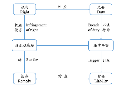 在探討侵害權益得利及其返還之前,我們有必要對私法中的“權利-義務”、“救濟-責任”的構造體系稍作梳理,再將其還放入這一構造中,以明確相關概念。根據民法基本理論,一人之權利(right)對應的是他人之義務(duty),這里的義務既可能是積極、又可能是消極的,既可能是法定的、又可能是約定的。而一人的不法行為(wrong),作為或不作為,是對其義務的違反(breach of duty),并同時形成對他人權益的侵害(infringement of right)。進而,如果行為人的不法行為滿足了某一法律事實的構成要件,則權利人可依據相應的請求權基礎(Anspruchsgrundlage)或訴因(causes  of  action)向法院主張救濟(remedy),相對地,行為人則因其違反義務之不法行須為承擔法律責任(liability)。此構造如下圖: 在框架中,責任是法律關系一方主體違反自身義務或侵犯他人權利時,依照法律應承擔的強制性法律后果;這種強制性法律后果,在大陸法系被稱為一種“債”,而在英美法系被稱為一種“救濟”。① 如果把侵害權益得利這一法律事實放入上圖的框架中,那么行為人因其侵害他人權益的行為而獲得了利益,違反了法定的不作為義務,因此應承擔得利返還的責任;而對權利人而言,其權益因為行為人的侵害行為而受到損害,因此可以主張得利返還之救濟。但這一“侵害權益得利—得利返還”的構造,尚需解決兩個根本性問題,第一,得利返還救濟/責任承擔方式的正當性問題,即為什么侵害權益得利之法律事實可以引發法律上的返還效果;第二,如果可以引發得利返還,那么得利返還的請求權基礎是什么。在探討這兩個根本性問題之前,我們首先要對所謂侵害權益得利行為進行充分的理解,并明確其在現有法律概念體系中的坐標。