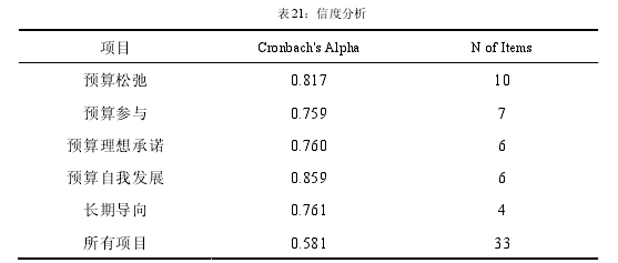 樣本的信度即樣本的可靠性的分析,  Cronbach  α 信度系數是最常用來衡量可靠性的,根據 nunnally(1978)的建議,Cronbach α 信度系數在 0.5-0.7 之間為可信,量表的信度系數最好在 0.7-0.9 時為很可信。因此,可以看出本文整個問卷和各變量取得的數據都在可信指標以上,表明問卷可信度較好。 具體如下表所示:  內容效度指的是測量目標與測量內容之間的適合性與相符性。在問卷編制過程中,我們嚴格界定了問卷的內容范圍,即從預算在企業管理中的重要性,到預算管理"人文化”的發展趨勢,再具體結合前人在預算松弛、預算參與、組織文化和薪酬方案的研究成果進行歸納和分析。問卷編制之后由會計專業人士及財務管理專業的人士進行了討論修訂,一致評價該問卷編制得較好。結構效度是指測量工具反映概念和命題的內部結構的程度。它一般是通過測量結果與理論假設相比較來進行檢驗。主成分分析法是測量結構效度的常用方法,并同時運用最大方差旋轉法,得出 KMO 值和 Bartlett 的球形度檢驗,來確定樣本數據是否適合做因子分析。