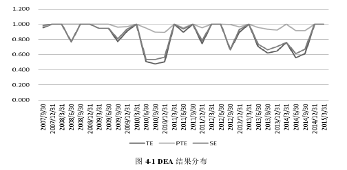 (2)本文選用了自 2007 年第三季度到 2015 年第一季度共 31 條數據,通過運用數據包絡分析法(DEA),對 22 家直接的券商類上市公司股票定價效率進行實證分析,最終得出我國券商類上市公司定價效率總體水平較低的結論,尤其是在自 2010 年的第二季度至第四季度和自 2013 年第二季度至 2014 年第三季度兩個時期內,這一結論更加明顯。