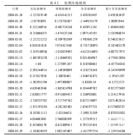 本文采用事件研究法來探討公司披露整體上市信息的短期市場效應。事件研究法是探討股價波動與市場某一事件之間相關性的一種統計方法,主要用于反映股價對信息披露的反應程度。在具體操作上,主要是通過異常報酬率(abnormal returns)的計算和分析來體現事件是否造成股價波動,進而以此判斷事件對于公司短期市場績效的影響。 本文通過對鹽湖鉀肥披露整體上市草案前后其股票的異常報酬率(AR)的計算分析,研究上市公司公告整體上市信息這一事件是否能夠如理論預期一樣給上市公司帶來正向市場績效。若股票的異常報酬率為正,則表明投資者看好企業整體上市帶來的收益,表明整體上市具有正向財富效應;反之,如果股票的異常報酬率為零或為負,那么就可以說明整體上市的市場反應為負向的,市場上的投資者并不看好整體上市對企業的影響,以致股價下跌,整體上市的公告效應為負。