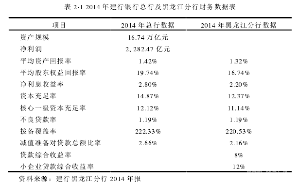 建設銀行黑龍江省分行是中國建設銀行所屬的一級分行。近年來,黑龍江分行發展迅速,截至到 2014 年底,共有市地分行 12 家,城區支行 96 家、縣級支行 56 家,分理處 224 家、儲蓄所 54 家。主要業務有存款、貸款、代收代付等,近幾年,增加了中小企業貸款項目,總體上看,黑龍江分行發展良好,2014 年建設銀行黑龍江省分行貸款綜合收益率達到 8%,居全國首位,其中中小企業貸款綜合收益率達到 12%,具體數據見表 2-1。建行在機構上設置了三級管理機制,即總行、分行、支行??傂?、省級分行、市級(自治區)分行設立管理部門,為管轄行;其余為經辦行,主要進行銀行業務處理。建行黑龍江分行在機構設置上按照建行總行的規定進行設置,分行設置管理部門、市地級分行、縣級分行、營業部。目前黑龍江分行的機構數量如表 2-2 所示。 黑龍江分行的存款主要包括財政性存款(待結算財政款項、財政性活期存款、地方財政庫款、財政預算專項存款和財政預算外存款)、全口徑存款(企業存款與個人存款、同業存款)。