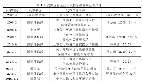 自從 1978 年實現改革開放到現在,我國已經邁入“十三五”計劃的開局之年。在國際大環境經濟頹靡的情況下,我國的經濟發展速度依然遠高于國際平均發展速度。但我們的經濟發展一定程度上是以犧牲環境為代價的。時有發生的環境污染事故已經嚴重影響到每個人的日常生活,這使得社會公眾越來越重視身邊的環境污染問題。2015 年末,隴南市西和縣的隴星銻業尾礦庫不慎發生泄漏,導致含銻尾礦及尾礦水經排水涵洞進入太石河,約 2.5 萬立方米的含銻尾礦及尾礦水泄漏,對沿線部分群眾生產生活用水造成了嚴重影響。2015 年,柴靜制作的霧霾調查紀錄片《穹頂之下》引爆了國人對霧霾與肺癌的狂熱討論,人們陷入了“PM2.5焦慮癥”。數據顯示,2015 年我國受霧霾天氣影響的面積約占國土面積 1/4,受影響人數約 6 億人,造成的經濟損失難以估計。頻頻發生的環境污染事故已經嚴重影響到每個人的日常生活,環境污染已經演變成一種威脅人類生存與發展的全球性危機,這迫使社會公眾越來越重視身邊的環境污染問題。 除了來自社會公眾的壓力,作為利益相關者的政府機構也將目光更多地投在企業保護環境方面的行為,同時要求企業將保護環境視為社會責任中不容忽視的一項重要任務。為了促使企業能夠更加積極主動地進行環境信息披露,我國先后頒布了一系列關于加強企業環境保護和做好環境信息披露的法律法規及規范性文件,這都為企業規范自身的環境信息披露行為提供了法律保障。表 1-1 列示了我國自 2007 年以來頒布的企業環境信息披露規范性文件。 2007 年我國環保部頒布《環境信息公開辦法(試行)》,辦法要求企業及其他經濟組織部門要按時進行環境信息披露,環境信息披露須符合一定要求。2008 年,上交所出臺的《上市公司環境信息披露指引》,該指引對上市公司的環境信息披露提出完整、準確、及時的要求。2010 年,環保部出臺《上市公司環境信息披露指南》,明確指出重污染行業要定期公開披露環境信息,對于其他非重污染行業則以鼓勵為主。2015 年初,中國出臺并且實施了《中華人民共和國環境保護法》。