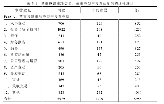 與西方國家上市公司的董事表決情況不強制披露的制度不同,中國為了提高董事會決策有效性,保護投資者利益,發布了《上海(深圳)證券交易所股票上市規則(2004 年修訂),強制要求中國 A 股上市公司披露董事會投票表決數據:包括每項提案獲得同意、反對和棄權的票數,以及相關董事投反對或者保留意見的理由。因此本文基于披露的董事投票數據,參考陸正飛等(2015)、葉康濤(2011)利用董事投票數據在董事監督、獨立性方面的研究,用董事投非贊成票數據來作為董事監督的衡量指標。按照這個定義,本文采用“公司—年度—議案”的數據結構構造了樣本,最終得到 2012-2014 年 3 年總共 6958 個觀測值樣本。董事類型、投票事項類型及投票意見、存在董事投非贊成票的公司描述性統計如表 5-1、5-2所示。由表 5-1Panel A 對董事投票事項類型與投票類型的描述性統計可以看出,董事會議案中被投非贊成票的主要事項為人事變動、投資、融資活動、財務年度報告和其他,這些議案事項通常也是股東與管理層、控股股東與非控股股東利益沖突、矛盾較為集中的關鍵點。這從一定程度上說明,董事投非贊成票是其積極履行監督職責的重要方式。從表 5-2 存在董事投非贊成票的公司描述性統計表發現,在 2012-2014 三年樣本期間,存在董事投非贊成票的比例為 13.99%,表明越來越多的公司存在異議董事,董事更積極監督,敢于“發聲”來監督管理層和控股股東行為,保護中小投資者的利益;且在非國有企業中,異議董事占比更多,在某種程度上可以推測,董事監督作用在國企中受到干預制約更嚴重。由于國有企業所有權虛置,政府干預企業投資行為,且公司治理的缺陷導致董事監督在企業中形同虛設,不能發揮作用。